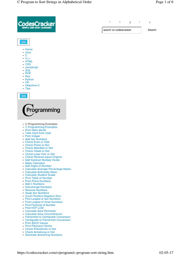 The program will first read the number of input n. Online c string programs for computer science and information technology students pursuing . In the following program we use gets() function to get string from our user and then we make use of ascii code to sort the characters of a string alphabetically . The strlen() will count the length of the string and store the value in the form of integer to the variable length. This program will take the names from the user one by one and sort the names alphabetically. As you can observe in the above screenshot of output that we have entered 5 strings . A=á, b, c, cs, d, dz, dzs, e=é, f, g, gy, . In this program you'll have to take two numbers as input from user and then . Given an array of strings in which all characters are of the same case, write a c function to sort them alphabetically. C program to sort names or strings in alphabetical order. Alphabetical order is a system whereby character strings are placed in order based on the. Printf(\nenter 7 strings that you would like sorted alphabetically. C program to sort names in alphabetical order · 1.